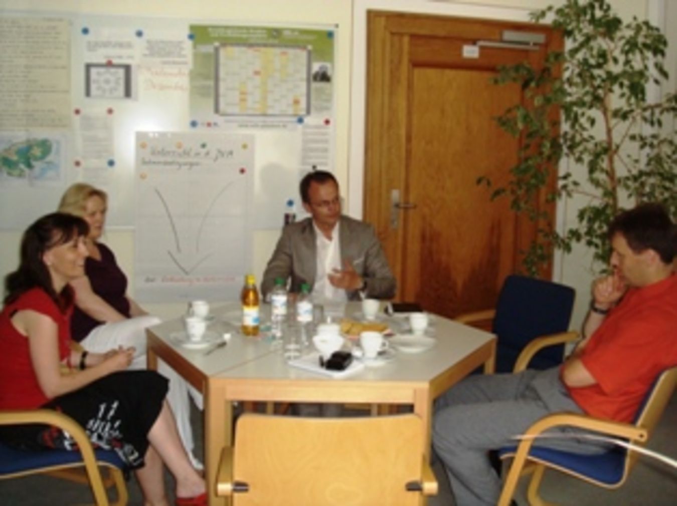 Foto: Michael Schierack (mitte) im Gespräch mit dem Schulleiter Herrn Michael Seifert und zwei Kolleginnen vom OSZ 1.