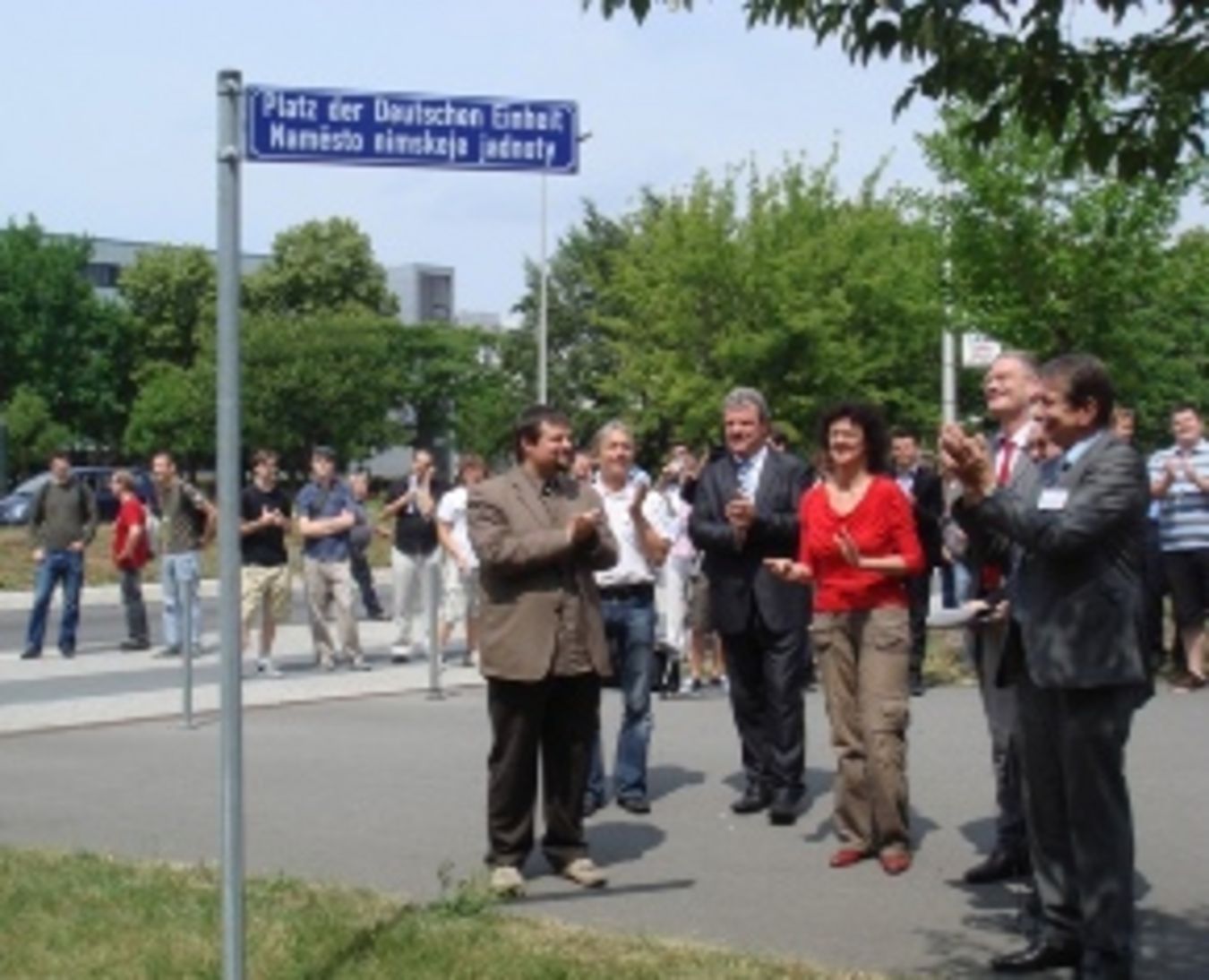 Foto Mitte: Enthüllung des Straßenschildes und Einweihung des „Platzes der Deutschen Einheit“.